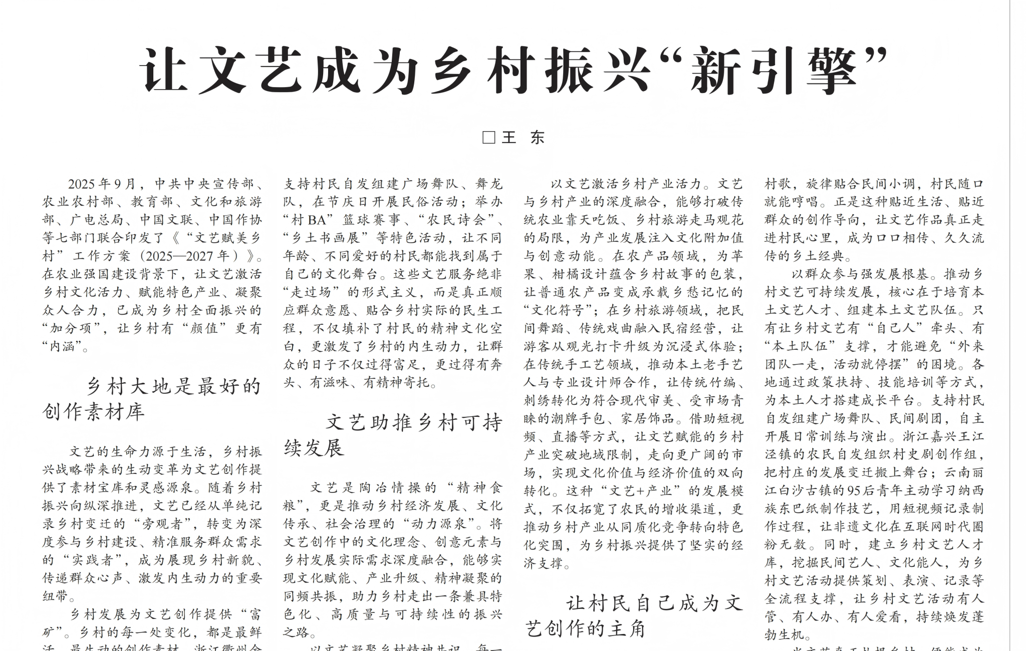 《学习时报》(2025年12月05日第06版)文化教育版刊发我校马克思主义学院王东博士文章《让文艺成为乡村振兴“新引擎”》。文章指出,文艺既是乡村变革的灵感来源与实践参与力量,其服务形态也随着农民多元文化需求从“有得看”向“看得好”不断提质升级。通过激活乡村文化基因、赋能特色产业发展、凝聚乡土精神共识,文艺能够为乡村可持续发展注入源源不断的动能。其核心路径在于坚持以村民为文艺创作与活动的主体,积极培育本土人才,...