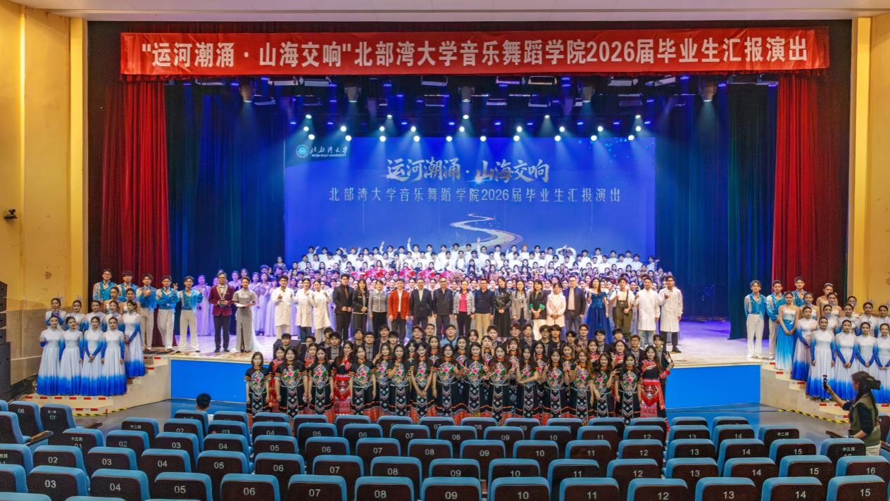 12月8日晚,学校音乐舞蹈学院2026届毕业生汇报演出“运河潮涌·山海交响”在礼堂举行。校党委书记、校长苗剑,校党委常委、副校长马秀明、陈丹、闫松银,与千余名师生一同观看演出。本场演出分为“源自溪流·初心如磐”“帆影书香·桃李成荫”“通江达海·故土情深”“向海图强·潮头放歌”四个篇章。在欢快的开场曲《欢腾的节日》中汇演拉开帷幕。第一篇章中,合唱《小河淌水》《鸳鸯・饮江》勾勒山水意境,舞蹈《黔・行》展现地域风情,...