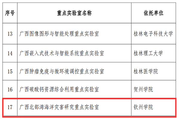 近日,自治区科技厅发布通知(桂科基字〔2018〕116号),依托钦州学院海洋学院建设的广西北部湾海洋灾害研究重点实验室完成了2年的培育期,经专家现场考察和综合评议,批准认定为第八批自治区重点实验室。这是自治区科技厅为贯彻落实全区创新驱动发展大会精神,进一步完善自治区重点实验室布局而实施的重要工作,也是我校科研平台建设取得的重大成绩。广西北部湾海洋灾害研究重点实验室于2016年10月被自治区科技厅认定为第五批...
