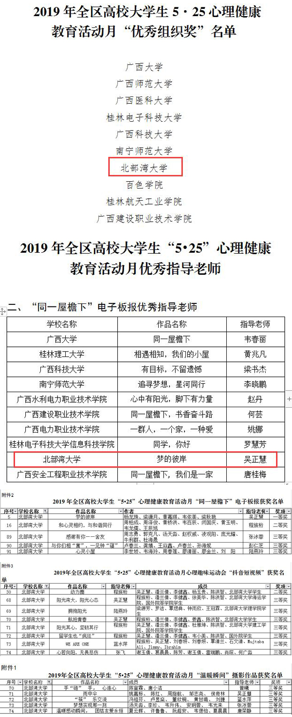 近日,从《自治区教育厅关于公布2019年全区高校大学生“5·25”心理健康教育活动月主题活动获奖名单的通知》(桂教思政〔2019〕10号)获悉,我校获得此项活动开展以来的最好成绩。在本次活动中,我校荣获“优秀组织奖”。在“同一屋檐下”电子板报、心理趣味运动会“抖音短视频”、温暖瞬间”摄影等评比活动中,我校学生参赛作品获得一等奖1项、二等奖2项、三等奖15项,吴正慧老师被评为“同一屋檐下”电子板报评比优秀指导老...