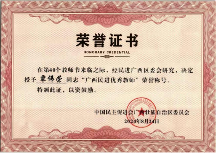 8月24日上午,民进广西区委会举行“广西民进优秀教师”荣誉称号颁授仪式,表彰160名广西民进优秀教师。民进广西区委会副主委罗真宣读了《民进广西区委会关于表彰“广西民进优秀教师”的决定》。我校民进会员,资源与环境学院教师覃伟荣、经济管理学院教师王淑慧、海洋学院教师吴海萍等三人荣获“广西民进优秀教师”荣誉称号。获奖教师表示,将继续坚持学习,不断提高自身素质,以更加饱满的工作热情投入到教学工作中,认真履行民进会员义务,...