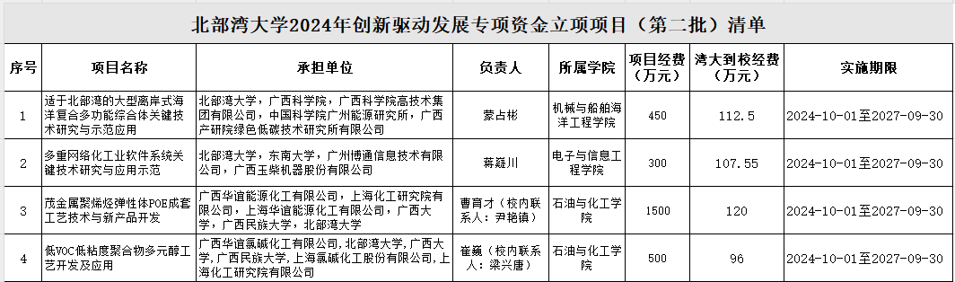 近日,自治区科学技术厅公布了2024年创新驱动发展专项资金新立项项目(第二批)的立项名单。我校牵头申报的中国—东盟产业合作区建设专项获得2项立项;参与申报的广西绿色化工新材料“尖锋”专项项目获得2项,合计到校经费400余万元。中国—东盟产业合作区建设专项项目是我校首次获批立项,标志着我校在面向东盟科技创新与区域经济发展领域迈出了重要一步。科技处相关负责人表示,学校将以此为契机,严格按照项目要求,科学规划、精心组织项目实施,...