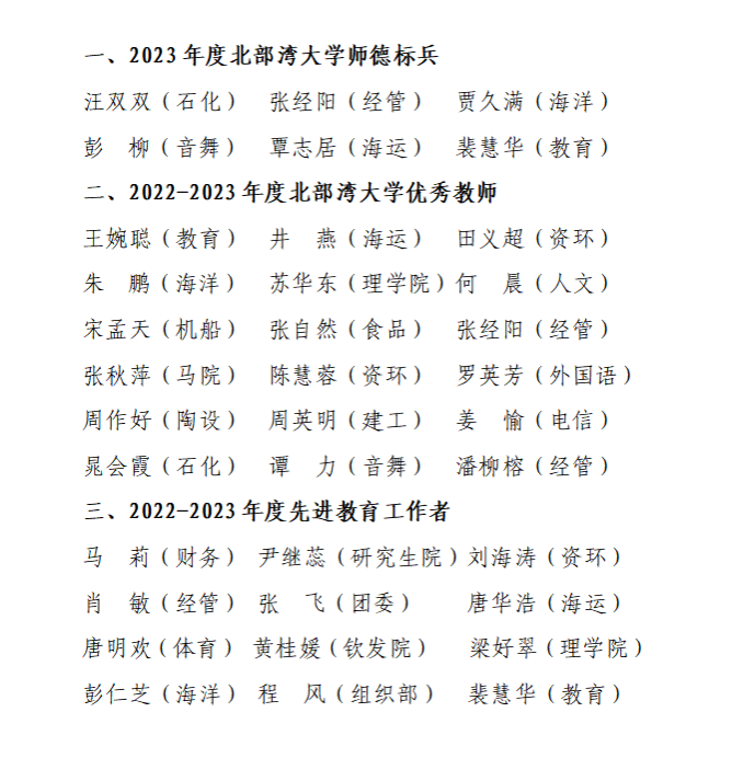 近日,在第40个教师节到来之际,学校完成了校级师德标兵、优秀教师、优秀教育工作者的评选活动。汪双双等6名教师荣获“2023年度北部湾大学师德标兵”荣誉称号,王婉聪等18名教师荣获“2022-2023年度北部湾大学优秀教师”荣誉称号,马莉等12名同志荣获“2022-2023年度先进教育工作者”荣誉称号。34名获得校级表彰的教师,在他们身上集中体现了广大教师兢兢业业、任劳任怨、甘于奉献、勇于开拓的优秀品质。今后,学校党委教师工作部、...