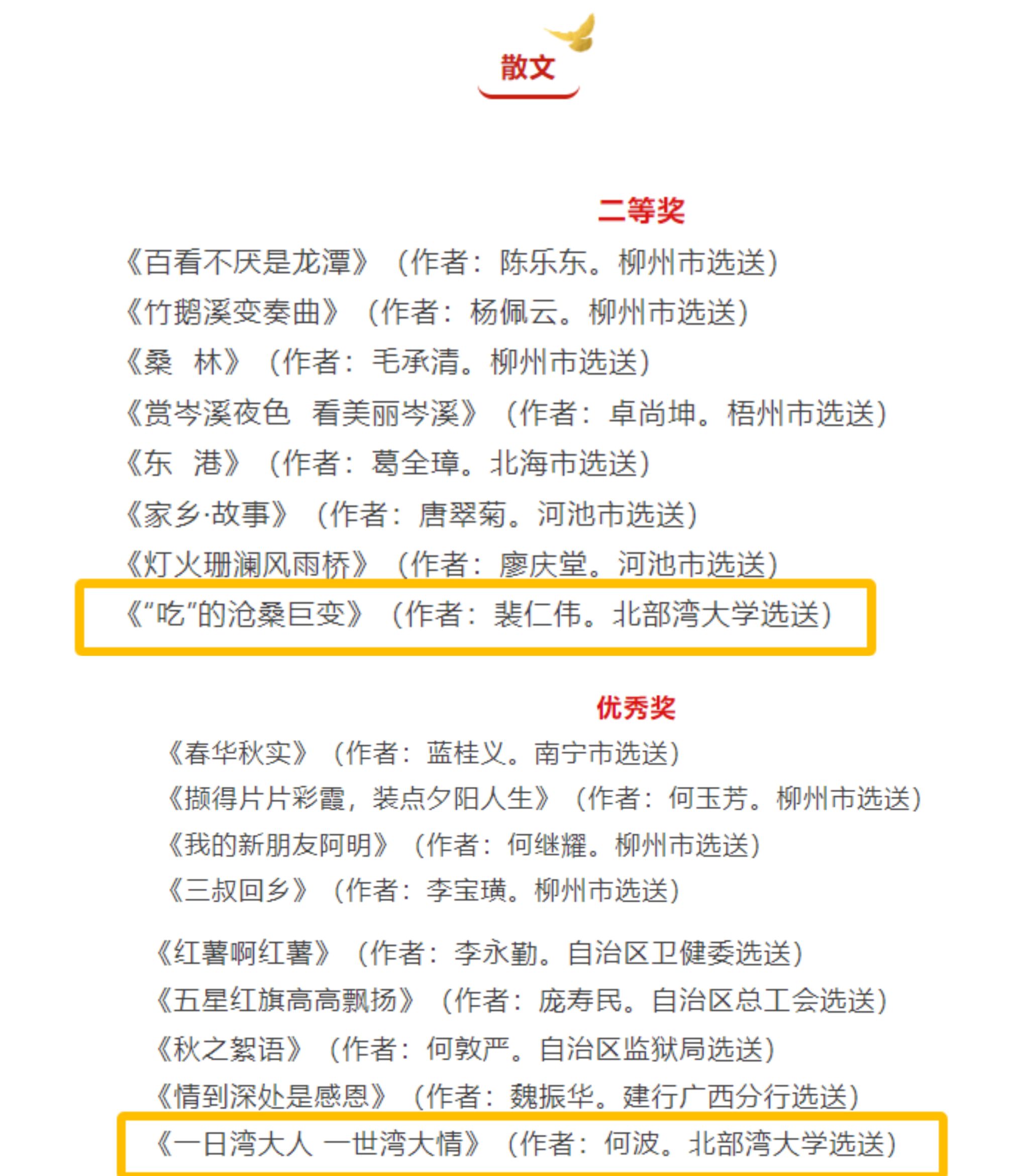 11月18日,自治区党委老干部局公布了广西第十二届“多彩金秋”文化活动主题征文的评选结果。我校退休教师裴仁伟撰写的散文《“吃”的沧桑巨变》荣获二等奖,何波撰写的散文《一日湾大人一世湾大情》荣获优秀奖,张蔓燕撰写的诗歌《家国情怀》荣获优秀奖。据悉,此次主题征文共收到各市、部分区直单位选送作品955篇(首),最终评选出一等奖10篇(散文4篇、诗歌5首、其他1篇);二等奖20篇(散文8篇、诗歌10首、其他2篇);三等奖30篇(...