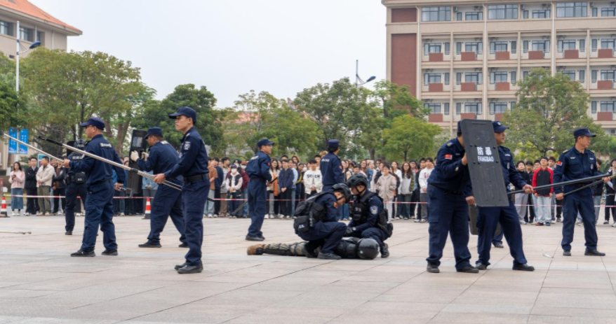 12月6日下午,学校联合钦南区公安局开展反恐应急处突演练。此次演练由学工部(处)、保卫处、后勤保障处以及神勇保安物业有限公司、沙埠社区卫生院共同参与配合,校属各部门安全管理员、实验室管理员等到场观摩。200名学生代表参加演练。演练现场,手持危险器械的“暴恐分子”无视警告,非法闯入校园,学校立即启动反恐防暴应急预案,并迅速报警、疏散周边的师生。安保人员反应迅速、分工明确,与第一时间到场的公安民警默契配合,成功将“...