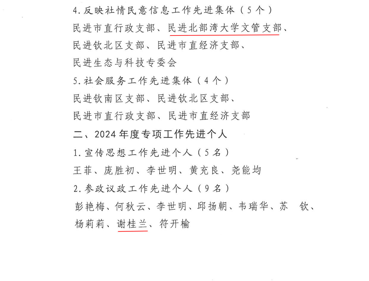 近日,从民进钦州市工委发布的《关于表彰2024年度先进集体和先进个人的决定》获悉,北部湾大学民进文管支部荣获“反映社情民意信息工作先进集体”荣誉称号,民进会员谢桂兰荣获“参政议政工作先进个人”荣誉称号,民进会员黄志宇、王淑慧荣获“反映社情民意信息工作先进个人”荣誉称号,民进会员吴海萍荣获“社会服务工作先进个人”荣誉称号。民进湾大总支和会员教师在过去一年中认真履行党派职能,在参政议政、社会服务、建言献策等方面取得了显著成绩。...