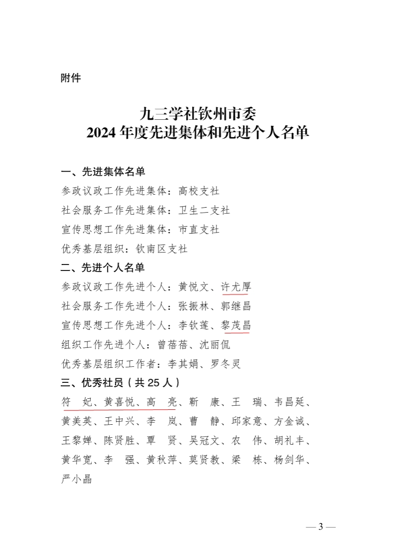 近日,从九三学社钦州市委《关于2024年度先进集体和先进个人的表彰决定》获悉,我校九三学社社员许尤厚荣获九三学社钦州市委2024年度参政议政工作先进个人荣誉称号,黎茂昌荣获九三学社钦州市委2024年度宣传思想工作先进个人荣誉称号,符妃、黄喜悦、高亮荣获九三学社钦州市委2024年度优秀社员称号。下一步,学校党委将一如既往地关注和支持民主党派的工作,为其履职尽责创造更好的条件和环境。同时不断加强与各民主党派的沟通交流,...