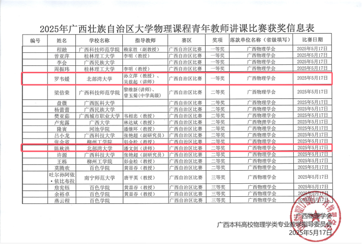 5月17日至18日,由广西物理学会、广西本科高校物理学类教学指导委员会主办,百色学院承办的2025年广西高校物理课程青年教师讲课比赛暨课程思政研讨会在百色举行。我校理学院教师罗韦媛、陈秋洪凭借出色的教学表现,在比赛中分获一等奖和二等奖。本次比赛吸引全区12所高校21名教师参赛。理学院两位教师通过生动的案例设计和深入浅出的讲解,将课程内容与思政元素有机融合,展现了扎实的教学功底和创新的教学理念。近年来,理学院持续推进大学物理课程教学改革,...