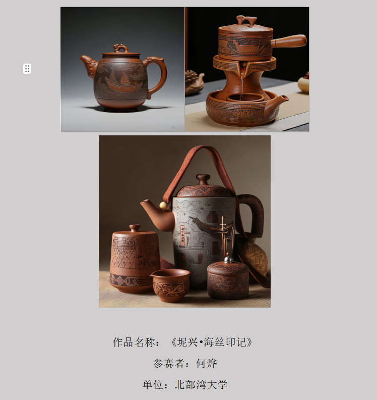 近日,由钦州市妇女联合会主办、我校陶瓷与设计学院承办、钦州市坭兴陶行业协会协办的AI赋能·钦州市女性坭兴陶文化创意设计大赛在我校开幕。本次大赛吸引来自北部湾大学、坭兴陶行业协会、钦州幼儿师范高等专科学校、广西英华国际职业学院等20余家单位的180余件作品参赛,经专业评审,50件优秀作品入围决赛。参赛作品通过AI技术辅助设计,将平陆运河文化、东盟文化、海洋文化、英雄文化等地域特色元素有机融入坭兴陶艺术创作。作品涵盖文创产品、...