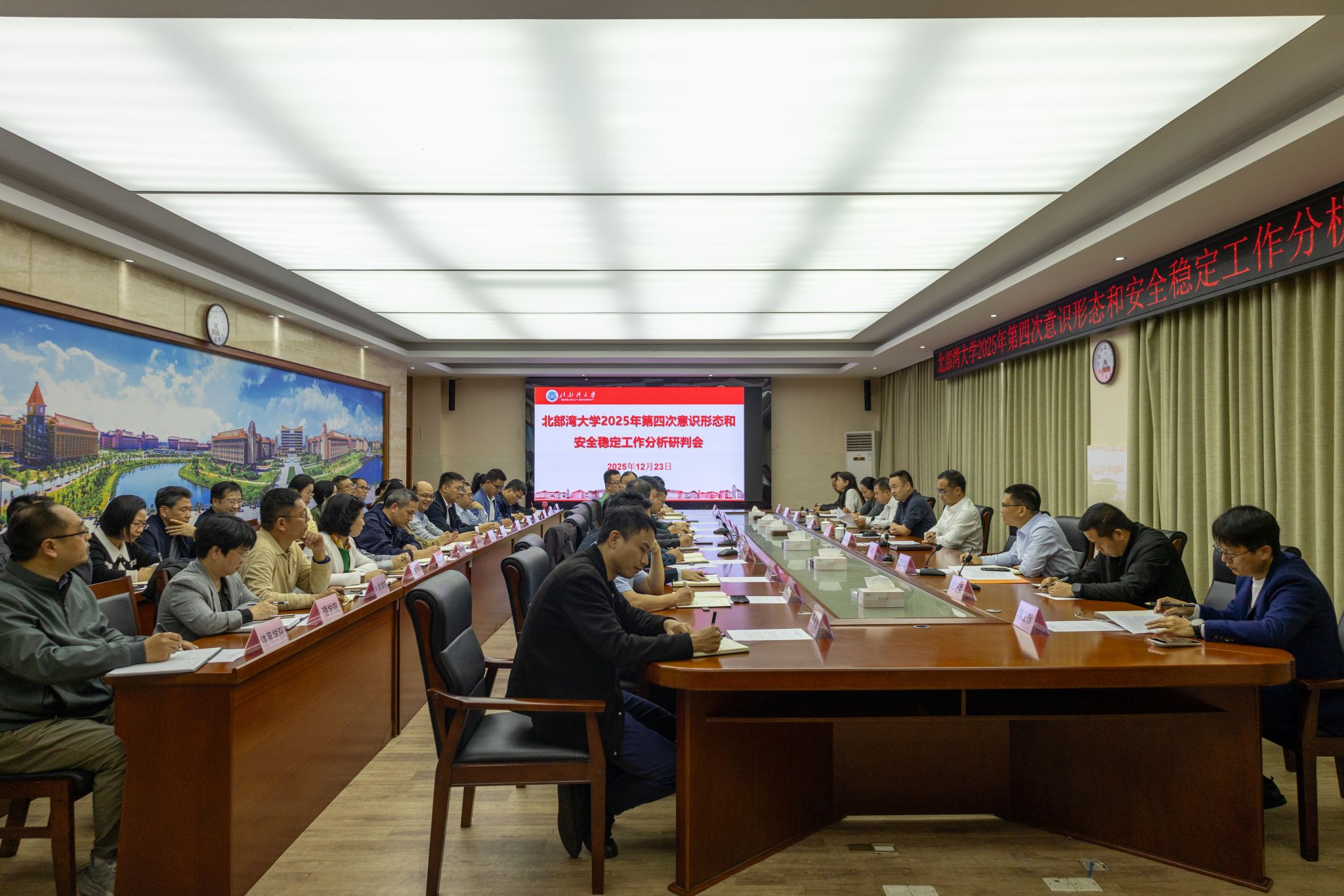12月23日,学校在办公楼523会议室召开2025年第四次意识形态和安全稳定工作分析研判会。校党委书记、校长苗剑传达了上级有关文件精神并讲话,党委常委、副校长马秀明对学校意识形态和安全稳定工作进行总体研判并提出具体要求,党委常委、副校长闫松银出席会议。学生工作处、保卫处、经济管理学院、外国语学院、人文学院依次作分析研判发言。会议强调,校园意识形态与安全稳定工作面临着复杂形势与多重挑战,须始终保持清醒头脑,坚持底线思维。...