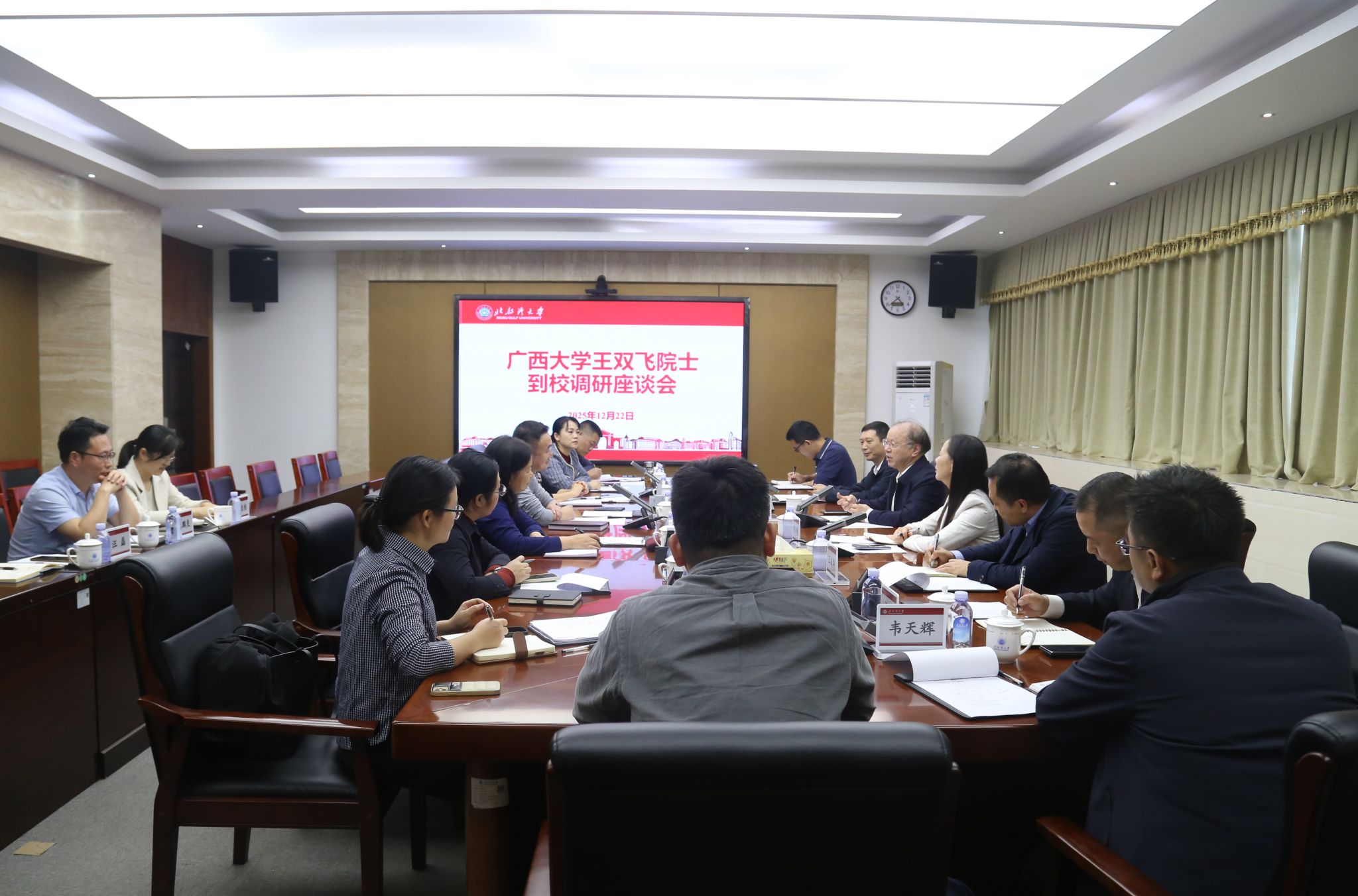 12月22日,中国工程院院士、广西大学教授王双飞一行到校调研,就学位点建设、学科建设、科研创新等在办公楼327会议室进行了座谈交流。校党委书记、校长苗剑主持座谈,校党委常委、副校长陆衡、陈丹,校长助理周丽娟出席。座谈会上,苗剑对王双飞院士一行的到访表示热烈欢迎,并感谢广西大学长期以来在对口支援工作中对我校发展建设的支持。他介绍了学校的发展建设情况,指出学校始终立足北部湾、服务广西、面向东盟,积极对接区域发展需求,...