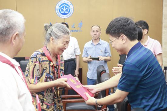 6月30日上午,学校在办公楼327会议室举行“永远跟党走,光荣在党50年”纪念章颁发仪式。校党委书记韩峻峰与“光荣在党50年”老党员同志,离退休教职工党委在职党员干部,退休党员代表以及青年教师党员十余人欢聚一堂,同庆党的生日,共忆初心使命。韩峻峰为符吉祥、黄世芬两位老党员颁发“光荣在党50年”纪念章,并送上了装入他们入党申请书的红色礼物。青年教师党员为老党员们敬献鲜花。“50年前的今天,我加入了中国共产党...