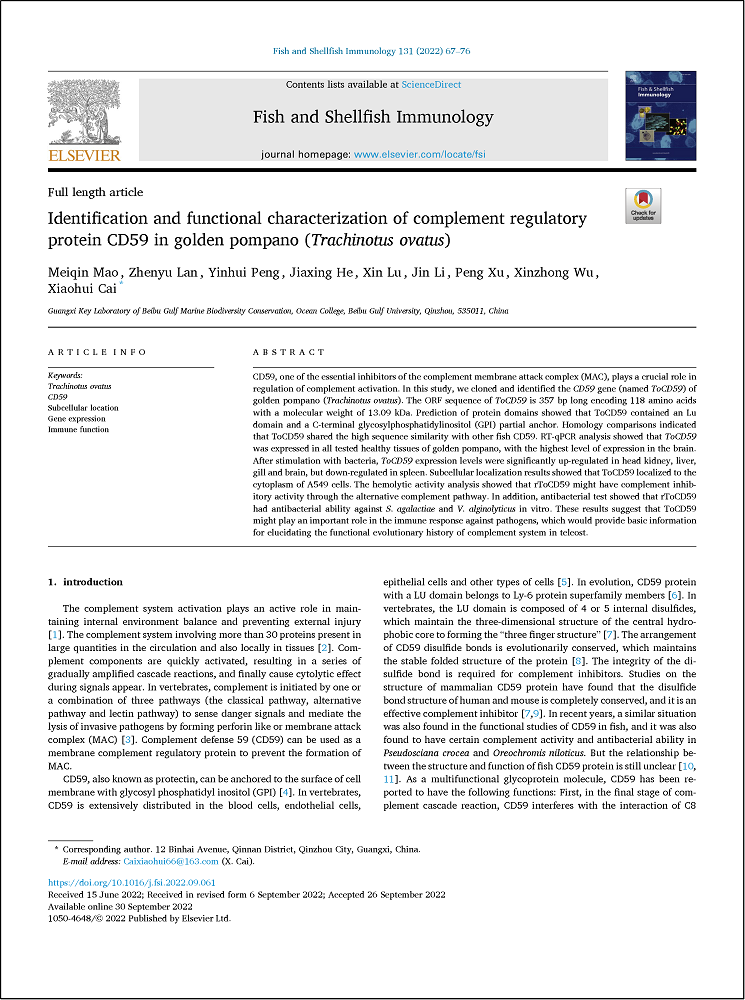近日,我校海洋学院硕士研究生毛美琴(第一作者),海洋学院蔡小辉博士(通讯作者),以北部湾大学第一作者单位,在《Fish and Shellfish Immunology》发表题为“Identification and functional characterization of complement regulatory protein CD59 in golden pompano (Trachinotus ovatus)”的论文。《Fish and Shellfish Immunology》是水产养殖专业研究领域的国际知名期刊之一,中科院一区TOP,最新影响因子为4.622。...