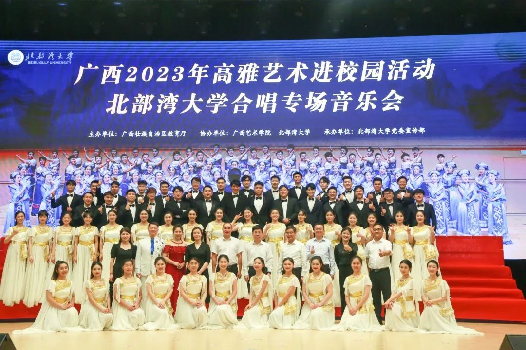 以乐怡情、以乐育人,用高雅艺术辐射文化温度。5月9日晚,广西高雅艺术进校园活动北部湾大学专场音乐会在学校礼堂隆重举行,活动特邀广西艺术学院合唱团进行专场演出。校党委书记韩峻峰,校党委副书记陈锦山,校党委常委、副校长唐高华、陈磊,校党委常委、宣传部部长马秀明出席音乐会。开场即高潮。音乐会以混声合唱《大地飞歌》《壮族敬酒歌》《三月三,九月九》《广西尼的呀》四曲联唱开场,带领观众踏着新时代的旋律走进壮...