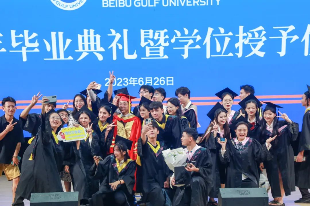青衿之志,履践致远。奋楫扬帆,赓续前行。6月26日上午,北部湾大学2023年毕业典礼暨学位授予仪式在礼堂隆重举行,5797名毕业生被授予学位,从湾大出发,共赴星辰大海。学校全体校领导出席典礼,各学院、各有关职能部门负责人共同见证这令人激动澎湃的时刻。当天,还有28名因疫情未能参加毕业典礼的2020至2022届毕业生返回母校来到现场。校党委副书记陈锦山主持典礼。典礼上,学校领导为2023届毕业生代表拨穗并颁发毕业证书、学...