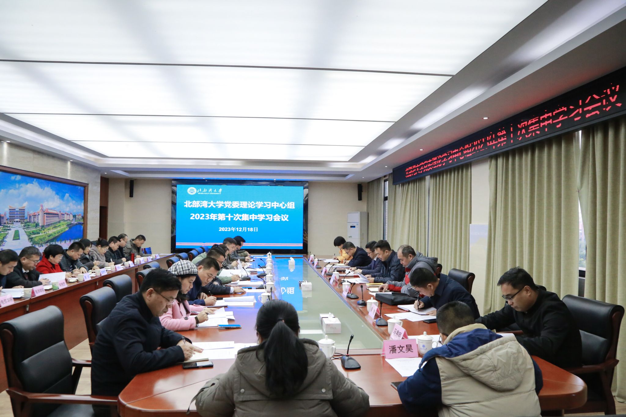 12月18日,学校在办公楼523会议室举行党委理论学习中心组2023年第十次集中学习会议。校党委副书记、校长苗剑主持会议。苗剑领学了习近平总书记12月14日、15日在广西视察时的重要讲话精神,以及习近平文化思想,还有全国、全区宣传思想文化工作会议精神。他强调,各二层机构党组织要坚持理论学习和业务工作两手抓两手都要硬,坚持不懈用习近平新时代中国特色社会主义思想凝心铸魂,在真学真懂真信真用、深化内化转化上下功夫,着力提高中心组理论学习的质量;...