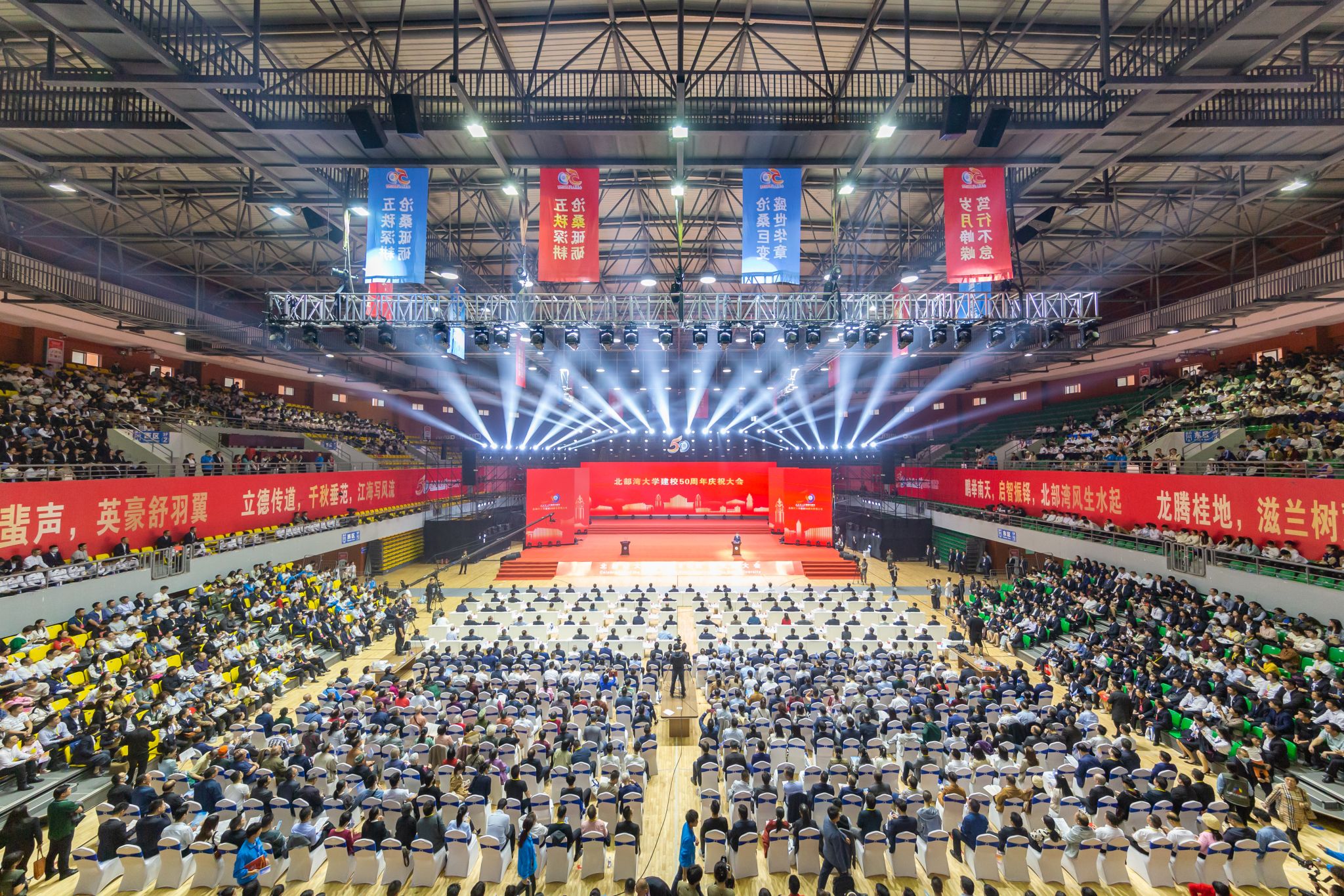 北部湾风生水起,五十载叶茂枝繁。12月10日,北部湾大学花团锦簇、彩旗飘扬。上午10时,北部湾大学建校50周年庆祝大会在学校体育馆隆重举行。自治区副主席李常官,中国工程院院士、广西大学教授王双飞,钦州市委书记钟畅姿,北海市委书记蔡锦军,防城港市委书记谭丕创,自治区人民政府副秘书长梁磊,自治区教育厅厅长刘友谊,自然资源部南海局局长雷波,自然资源部第一海洋研究所所长李铁刚,第四海洋研究所所长丰爱平,钦州市人大常委会主任覃天卫,...