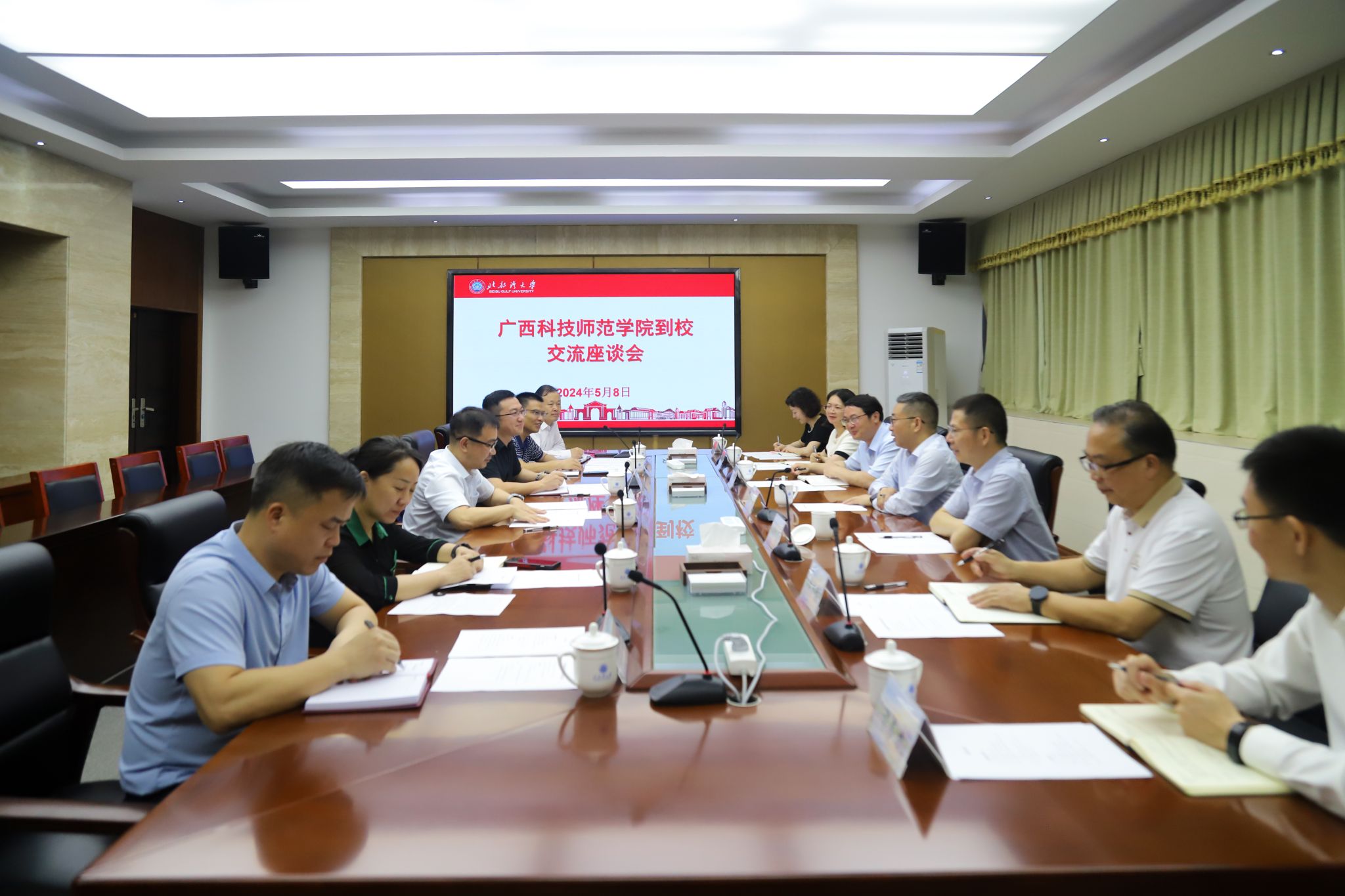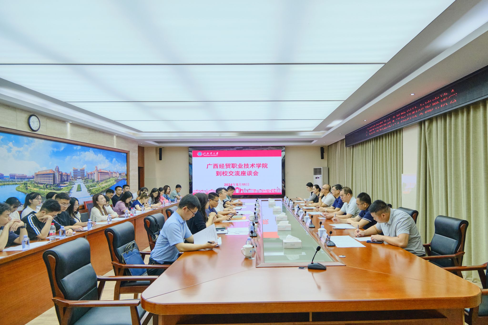 5月11日,广西经贸职业技术学院党委书记黄国健一行29人到校就学校办学特色、人才培养、学生管理等工作进行调研交流。校党委副书记陈磊出席会议。黄国健对我校的热情接待表示感谢,并简要介绍了广西经贸职业技术学院的办学特色、教学模式及国际化办学成果等基本情况。他表示,近年来,北部湾大学在校园文化建设、教学科研、教师队伍建设等方面取得了成效显著,希望两校充分发挥自身优势,在人才培养、科学研究、文化传承创新等方面深化校际合作,...