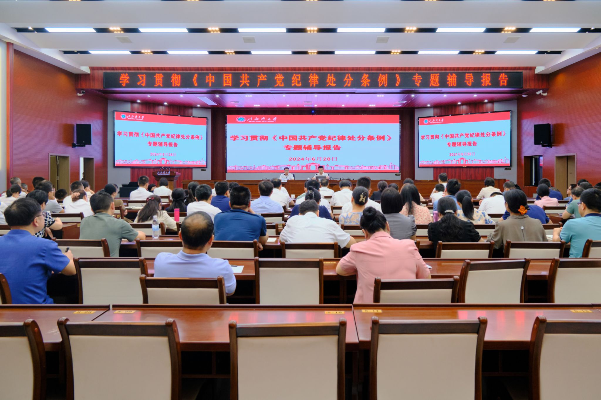 6月28日下午,学校在办公楼一楼报告厅召开学习贯彻《中国共产党纪律处分条例》专题辅导报告会。自治区纪委监委第九监督检查室主任高军鸿受邀作专题辅导报告。校党委书记徐华蕊主持。高军鸿结合自己14年丰富的审查调查工作经验和理论功底,详细解读了新修订《条例》的目的意义和规定要求,具体讲述了《条例》修订后体现的主要特点和重要意义,应用实例分析了《条例》每个章节主要的修改内容。他指出,从组织层面出发,党内监督体系中的党委、...