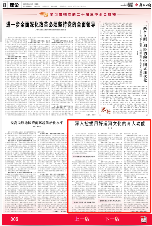8月8日,《广西日报》第8版理论专栏刊发我校党委副书记陈磊理论文章《深入挖掘用好运河文化的育人功能》。文章从“深刻理解运河文化的内涵和意义”“充分认识运河文化的教育价值”“创新运河文化育人模式与方法”三方面阐述。文章认为,地方高校应以平陆运河等运河文化资源为依托,深入挖掘运河文化的育人功能,把握运河文化与思想政治教育的契合点,把运河文化融入教材、融入课堂、融入实践,助推文化育人工作的高质量发展,培养好中国特色社会主义事业的建设者和接班人。...