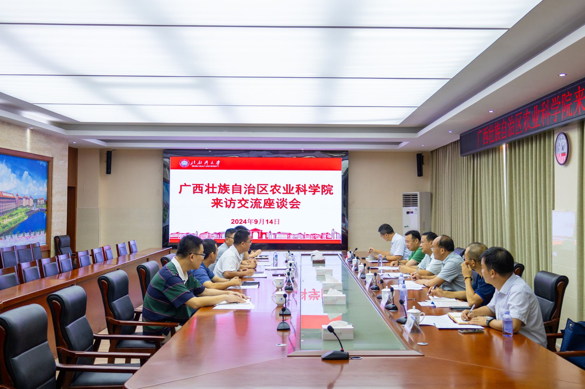 9月14日,自治区农业科学院党组成员、副院长陆宇明一行到我校就调研交流。校党委副书记陈磊会见了调研组一行,校党委常委、副校长梁智出席会议调研交流会。会上,与会双方对本单位近年来的改革发展、科学研究、队伍建设、基建项目建设等方面进行了深入交流,双方充分肯定了校院双方科研团队开展科技合作取得的显著成效,并达成了深化教育、科技、人才交流与合作的共识。党办校办、宣传部、科技处、财务处、基建处相关负责人参加交流活动。...