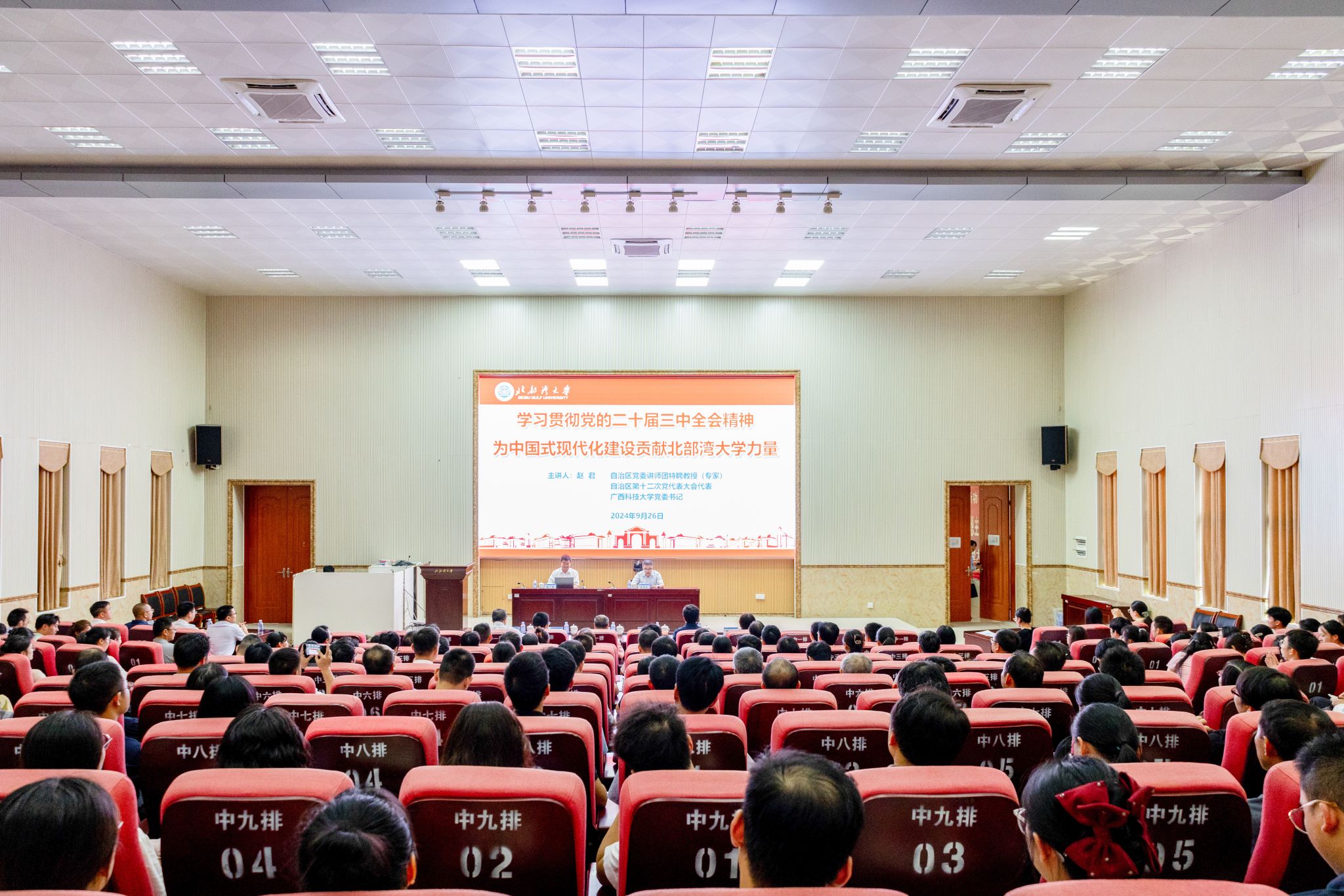 9月26日,学习贯彻党的二十届三中全会精神自治区党委讲师团特聘教授(专家)宣讲报告会暨学校党委理论学习中心组第五次集中学习(扩大)会议在我校12栋教学楼204报告厅举行。自治区党委讲师团特聘教授(专家)、自治区第十二次党代会代表、广西科技大学党委书记赵君作宣讲报告。校党委书记徐华蕊主持会议。报告会上,赵君以《学习贯彻党的二十届三中全会精神 为中国式现代化建设贡献北部湾大学力量》为题,从全会召开的重大意义、习近平总书记重要讲话精神、...