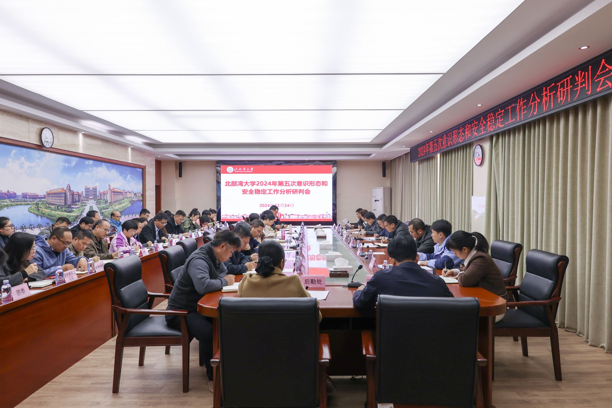 12月24日上午,学校在办公楼523会议室召开2024年第五次意识形态和安全稳定工作分析研判会。校党委副书记陈磊主持会议。会上,党委宣传部、学生工作部(处)、保卫处、教务处、国际交流处、海洋学院、机械与船舶海洋工程学院、经济管理学院、陶瓷与设计学院依次作分析研判发言。陈磊要求,各单位各部门要充分认识意识形态工作的重要性、紧迫性和严峻性,落实党管意识形态工作原则,压紧压实意识形态工作主体责任,推动意识形态工作融入日常、...