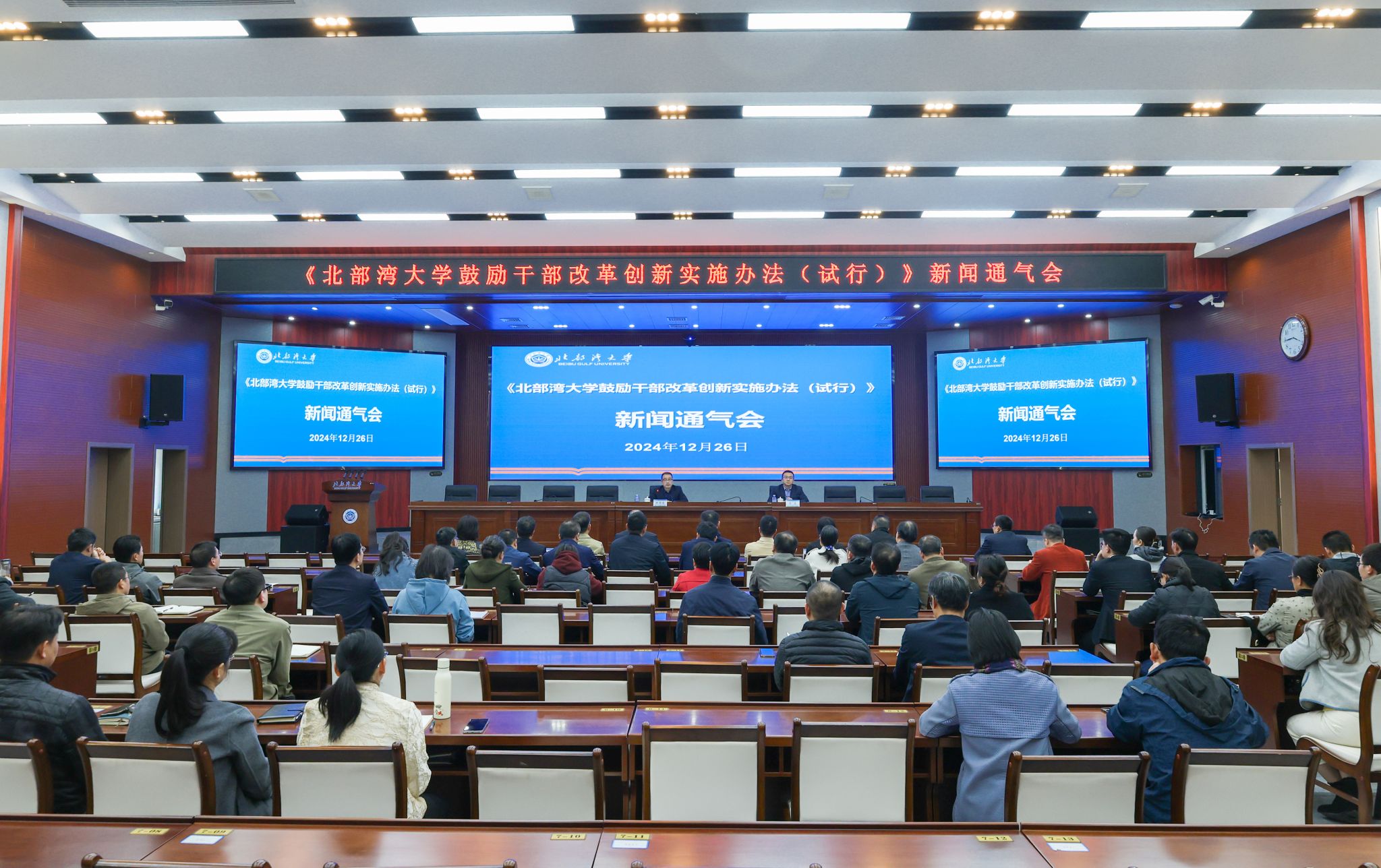 12月26日下午,学校在办公楼一楼报告厅举行“鼓励改革创新,激发干部活力”专题新闻通气会。校党委书记徐华蕊出席并作主发布。学校新闻发言人、校党委副书记陈磊主持通气会。全体在家校领导参会。徐华蕊从文件的出台背景、政策内容、主要目的、主要特点、实施建议等五个方面全面解读了学校鼓励干部改革创新实施办法。他表示,实施办法具有政治性强、突出鼓励、保障激励、责任明确、操作性强、简洁明了等特点,旨在鼓励干部在学校进一步深化人才培养体制机制改革,...