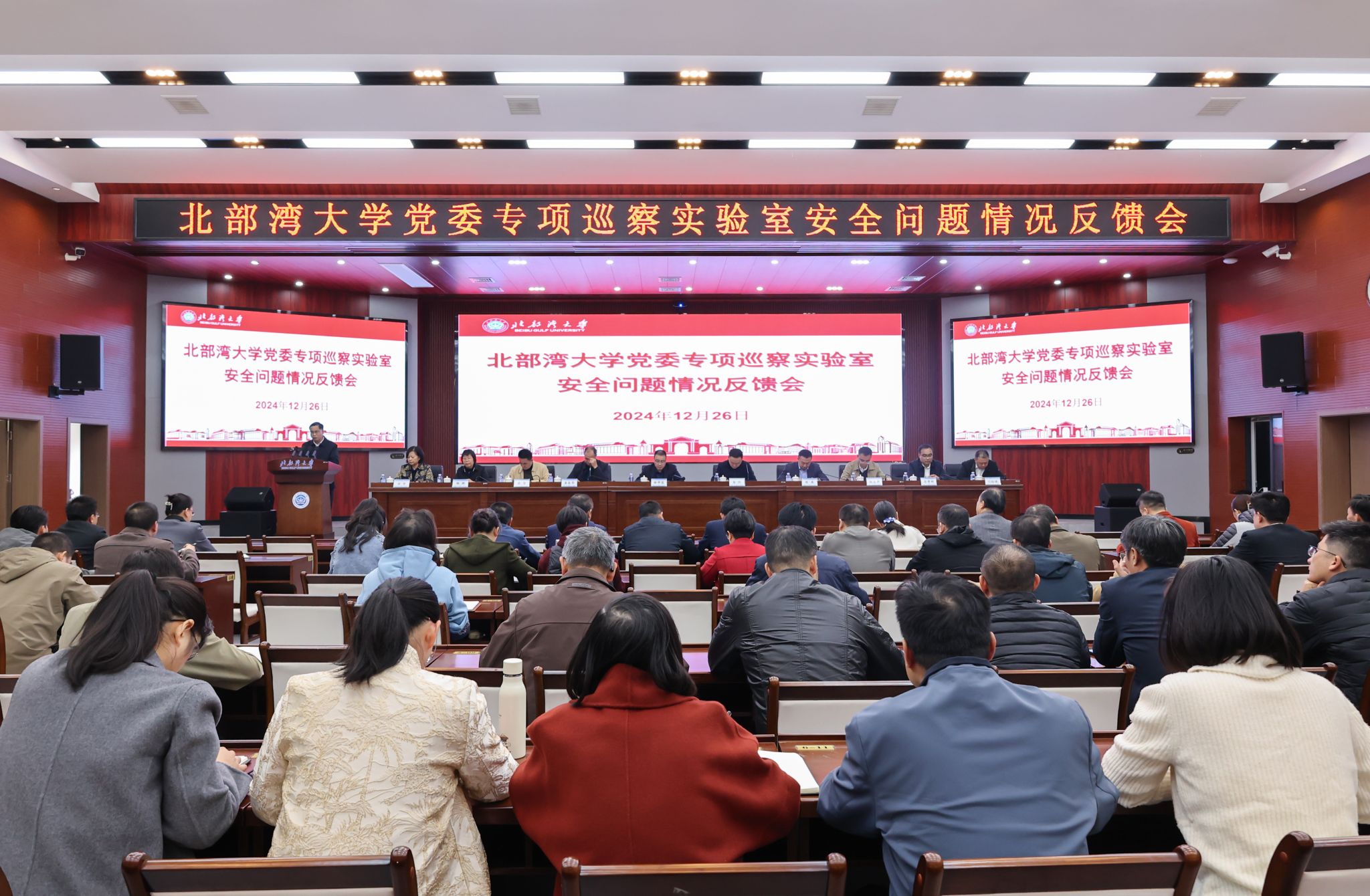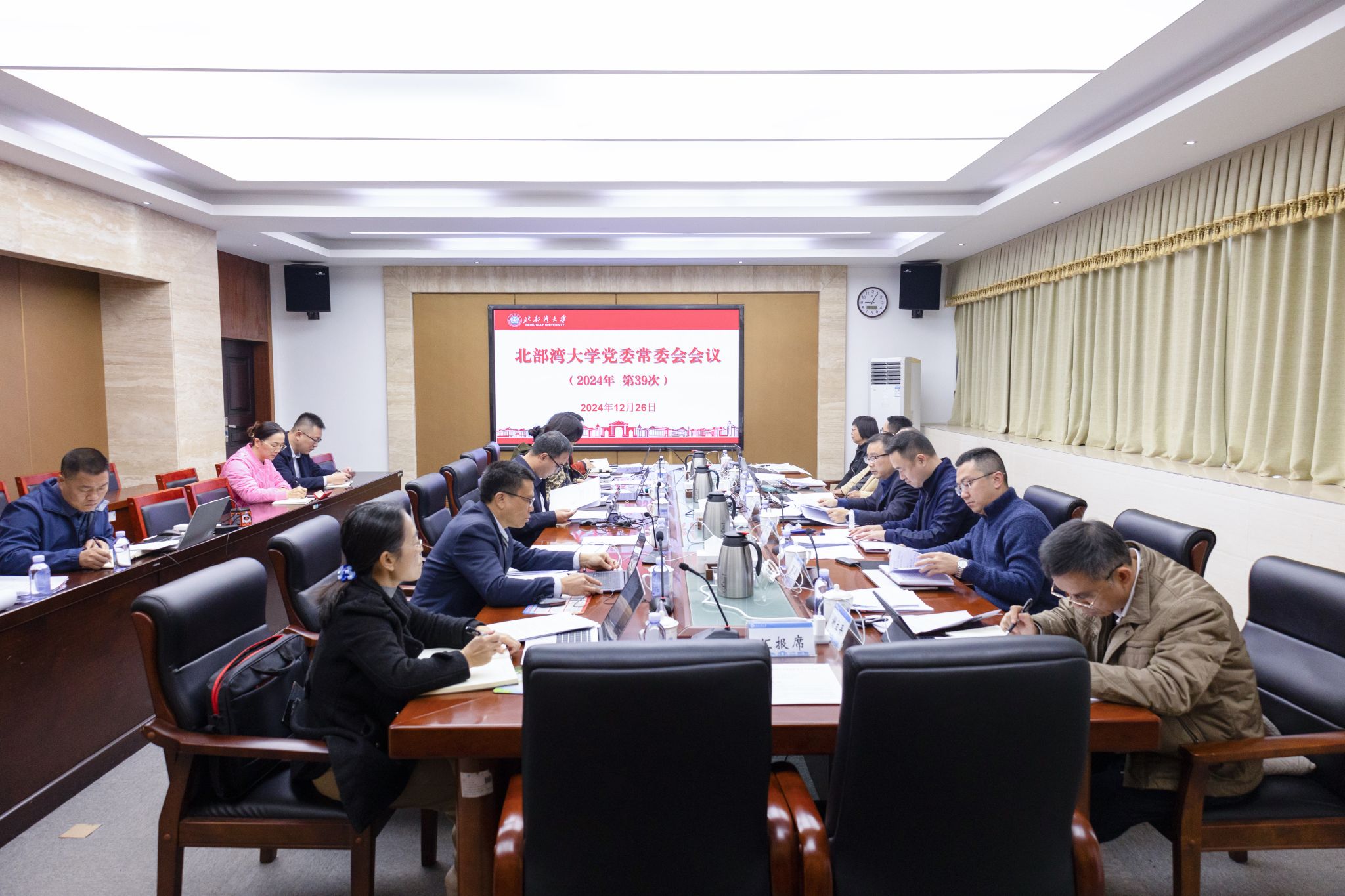 12月26日,学校在办公楼327会议室召开党委常委会,传达学习习近平总书记近期重要讲话重要指示精神。校党委书记徐华蕊主持会议并领学。相关职能部门负责人列席会议。会议强调,要深入学习贯彻习近平总书记在庆祝澳门回归祖国25周年大会暨澳门特别行政区第六届政府就职典礼和在澳门视察时的重要讲话精神,将之与学习贯彻习近平总书记关于广西工作论述的重要要求结合起来,围绕建设海洋强国和广西“一区两地一园一通道”建设,聚焦人才培养中心工作,...