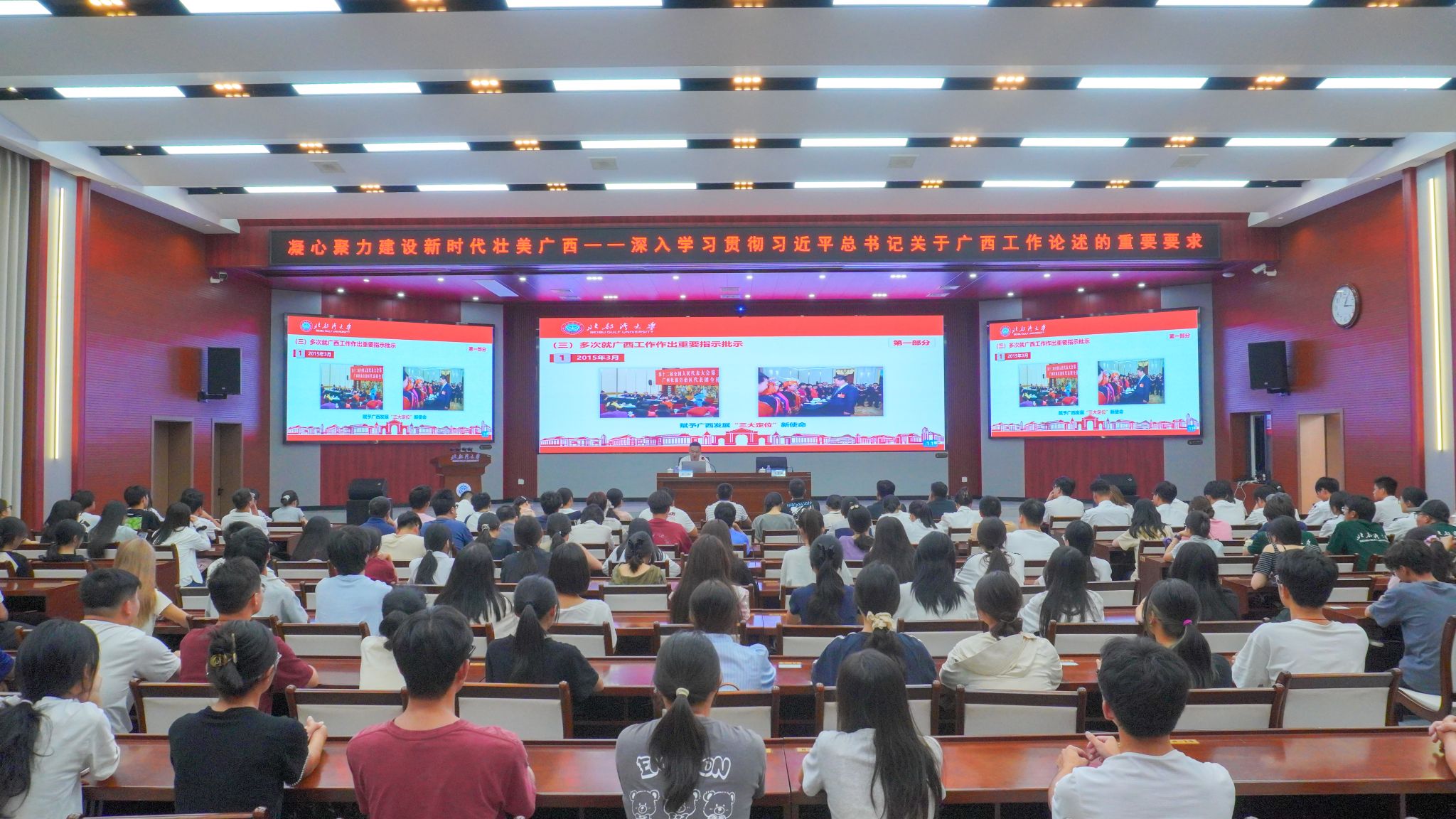 9月23日,校党委副书记、校长苗剑以“凝心聚力建设新时代壮美广西——深入学习贯彻习近平总书记关于广西工作论述的重要要求”为题,在办公楼一楼报告厅面向学校青年师生开展理论宣讲活动,上了一堂生动的“大思政课”。校党委常委、副校长马秀明主持。苗剑从习近平总书记关心关怀广西发展切入,通过讲述习近平总书记到广西考察调研的经过,深入剖析了习近平总书记关于广西工作论述的重要要求的内容体系,条分缕析地解读了其中的核心要点与精神实质,...