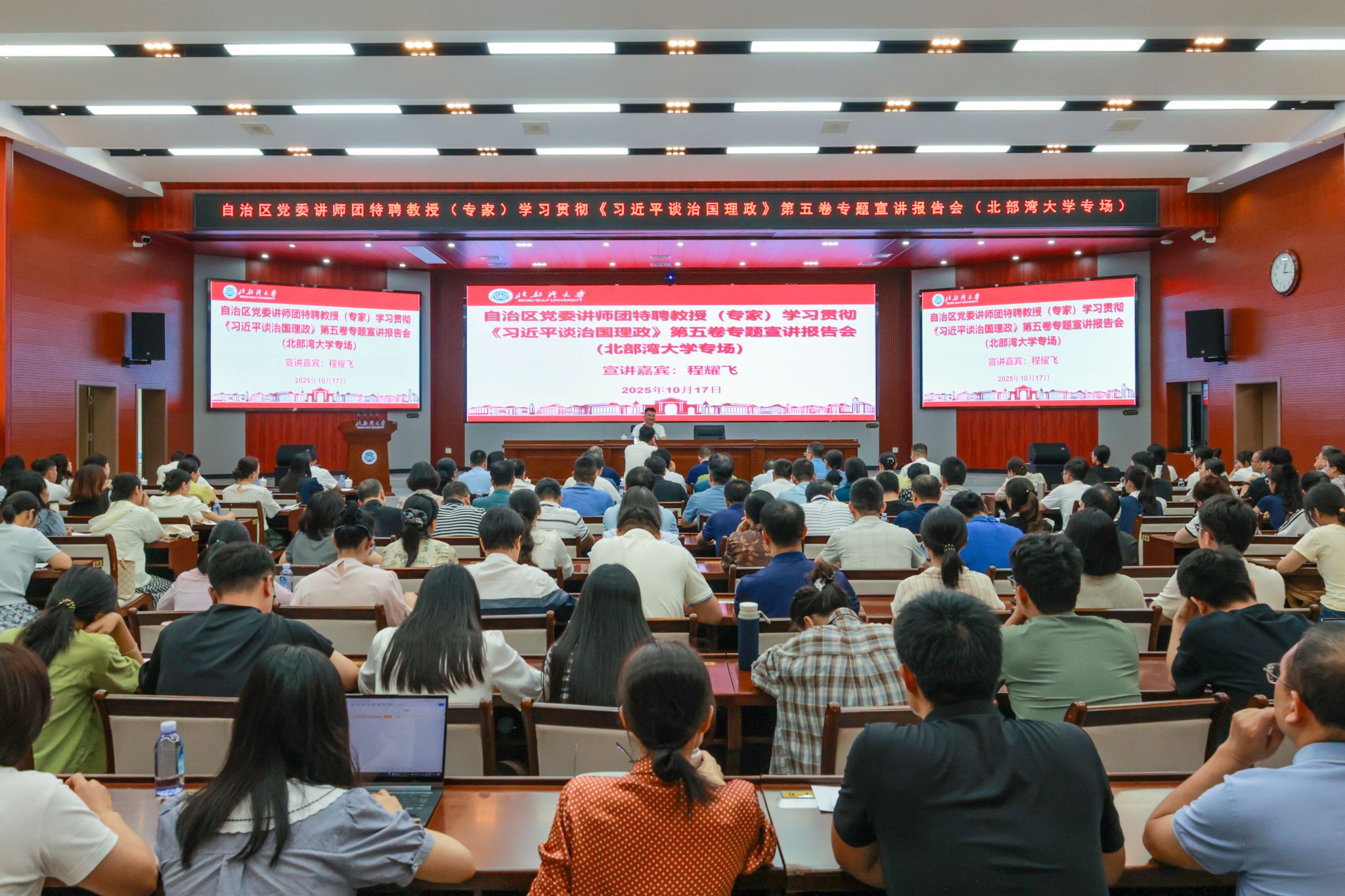 10月17日,学习贯彻《习近平谈治国理政》第五卷专题宣讲报告会暨党委理论学习中心组2025年第六次学习(扩大)会议在学校办公楼一楼报告厅举行。自治区党委讲师团特聘教授(专家),广西平陆运河建设有限公司党委书记、董事长程耀飞作宣讲报告。校党委常委、副校长马秀明主持。宣讲中,程耀飞从深刻领会《习近平谈治国理政》第五卷的时代背景、核心要义、学习要求等维度展开了系统的解读,特别是紧密结合了平陆运河建设的实际案例,生动阐释了《...