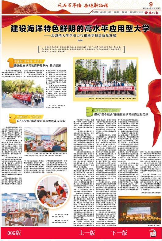 “从党的百年奋斗中,看清楚过去我们为什么能够成功;在启航新征程中,弄明白未来我们怎样才能继续成功。”北部湾大学把学习宣传贯彻落实党的十九届六中全会精神、扎实推进党史学习教育同建设海洋特色鲜明的高水平应用型大学结合起来。11月19日,广西日报整版聚焦我校党委书记韩峻峰文章《建设海洋特色鲜明的高水平应用型大学——北部湾大学学史力行推动学校高质量发展》。文章围绕“早谋划、早布局、早启动,推动党史学习教育...