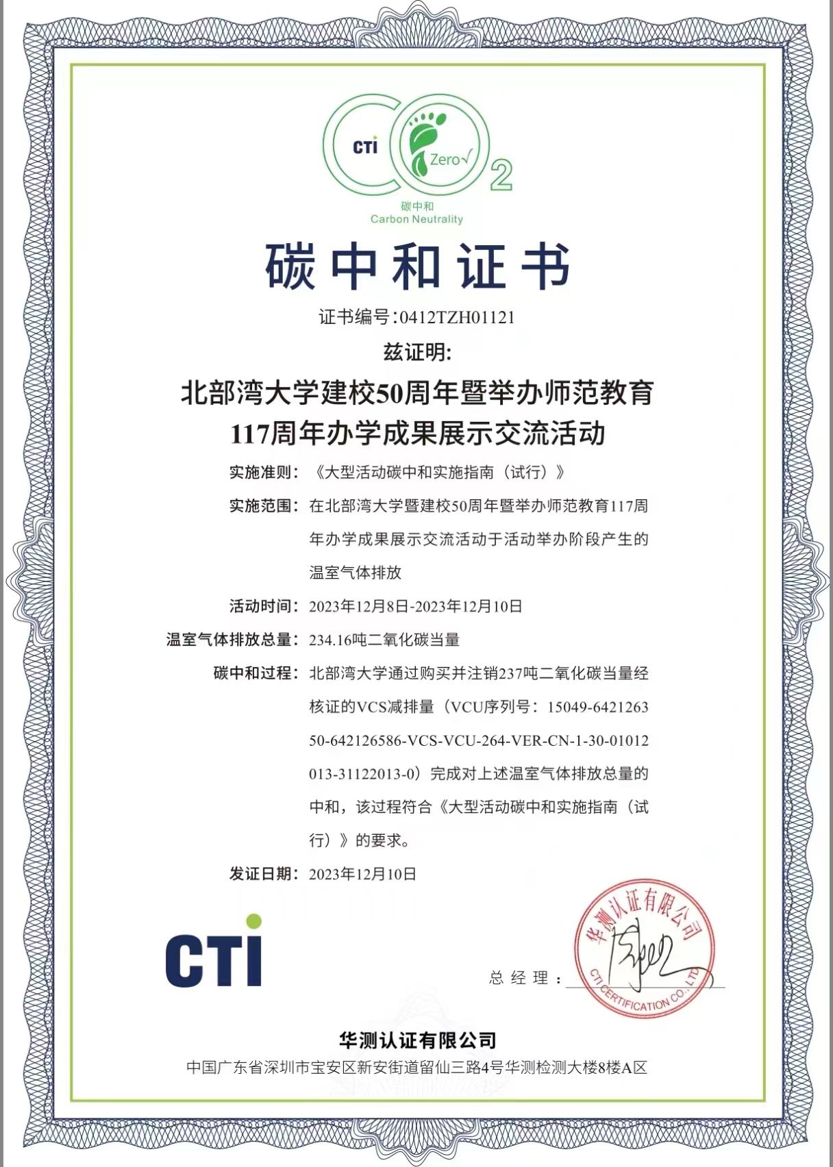 12月10日,北部湾大学校庆活动结束后获得了华测认证有限公司(以下简称“CTI华测认证”)颁发的PAS 2060碳中和认证证书。这一认证标志着北部湾大学成为广西首个获得 “碳中和”认证校庆大会的高校,为校园环境保护和全球气候变化应对贡献了力量。作为一所重视可持续发展的高校,北部湾大学一直以环境保护和社会责任为己任。此次50周年校庆活动,CTI华测认证受邀对此次活动进行碳排放测算。根据国家生态环境部发布的《大型活动碳中和实施指南(...