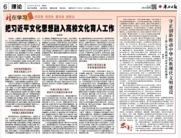 11月30日,《广西日报》第6版理论专栏头条刊发我校韩峻峰同志理论文章《把习近平文化思想融入高校文化育人工作》。文章指出,为党育人、为国育才,是高校的重要使命。以文化人、以文育人是高校加强思想政治教育工作、践行文化传承发展使命、培养时代新人的重要着力点。高校应持续加强对习近平文化思想的学习、研究、阐释,加快推进习近平文化思想进教材、进课堂、进头脑,提升大学生的文化自信,培养好中国特色社会主义事业的建设者和接班人。...