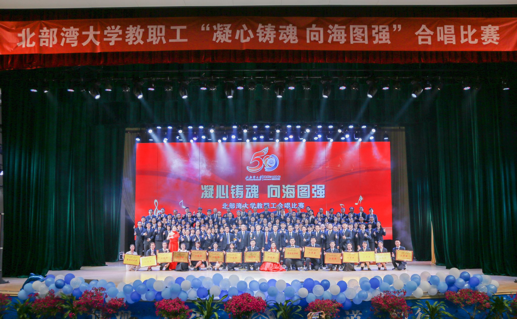 悠扬校歌,共祝五秩。11月30日晚,北部湾大学“凝心铸魂 向海图强”教职工合唱比赛在学校礼堂盛大举行。校党委副书记唐高华、陈磊,校党委常委、副校长梁智,校党委常委、纪委书记谢立平,校党委常委、副校长陆衡、马秀明出席比赛现场。来自各学院、各机关单位的合唱队身着统一服装,共唱校歌《向着大海去远航》,以高遏行云的歌声表达对学校五秩芳华的祝愿。唐高华在致辞中提到,五十载春秋,湾大人总能一步步突破难关,取得可喜的成绩。...
