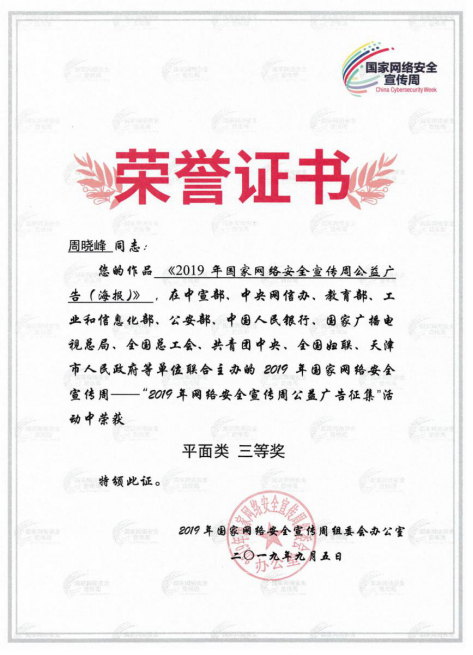 近日,由中央宣传部、中央网信办、教育部、工业和信息化部、公安部、中国人民银行、国家广播电视总局、全国总工会、共青团中央、全国妇联等部门联合举办的2019年国家网络安全宣传周公益广告设计大赛评选结果新闻发布会在天津召开。我校陶瓷与设计学院周晓峰教授的公益广告海报作品获得“三等奖”。据悉,本次宣传周公益广告公开征集活动历时1个月时间,面向全国征集以“网络安全为人民、网络安全靠人民”为主题的原创设计作品,...