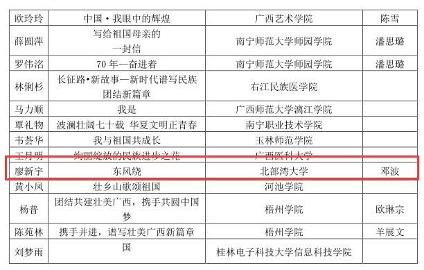 近日,根据桂教民教[2019]11号文件《自治区教育厅关于公布“喜迎新中国成立70周年 共话民族团结进步教育”征文活动评选结果的通知》获知,由党委宣传部邓波老师指导廖新宇创作的作品《东风绕》荣获高校组二等奖;党委宣传部陈烜严老师指导罗茵创作的作品《盛世盛景迎国庆大美中国新征途》荣获高校组三等奖。我校对此次征文活动高度重视,从5月份开始发征文通知,面向全校征集征文作品,9月汇集作品,集中挑选优秀作品4篇报送至...