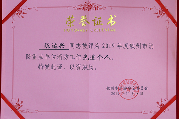 11月8日上午,从2019年钦州市“119”消防宣传月活动启动仪式上获悉,我校保卫干部陈达兴被评为2019年度钦州市消防重点单位消防工作先进个人。 荣誉证