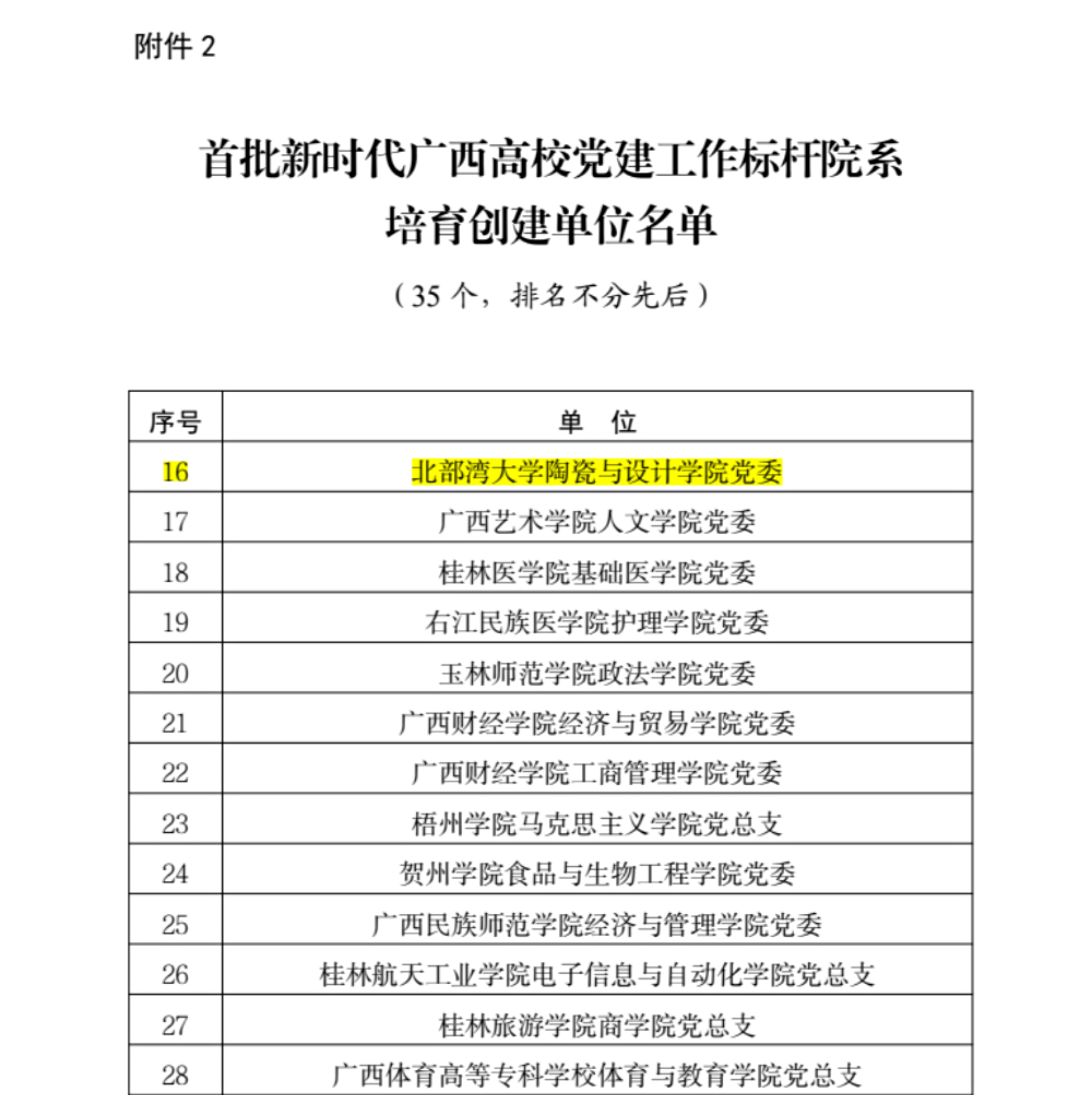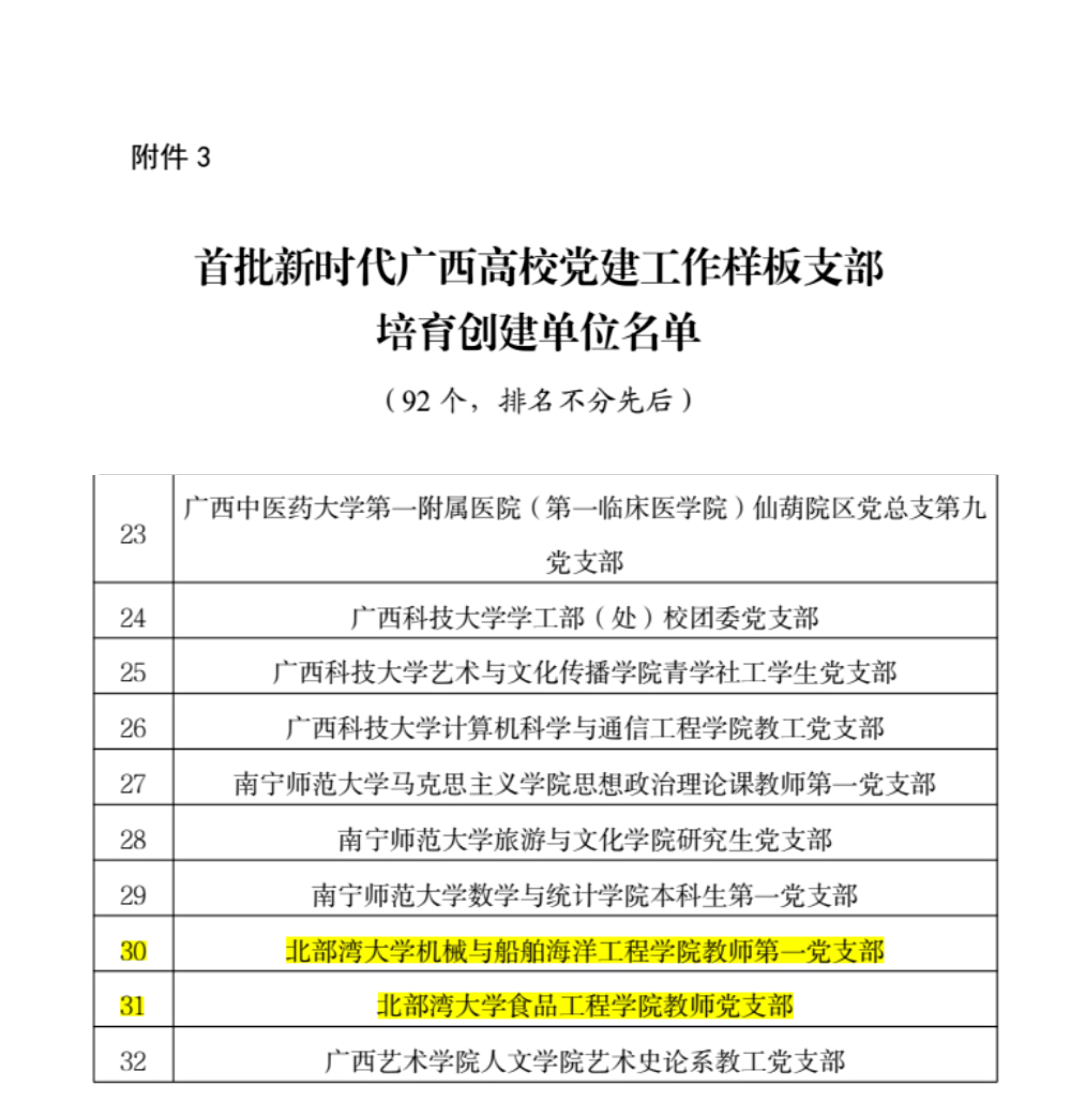 近日,自治区党委教育工委公布了首批新时代广西高校党建示范创建和质量创优工作、“双带头人”教师党支部书记工作室培育创建单位名单。我校陶瓷与设计学院党委荣获新时代广西高校党建工作标杆院系培育创建单位,机械与船舶海洋工程学院教师第一党支部、食品工程学院教师党支部同时荣获新时代广西高校党建工作样板支部培育创建单位。