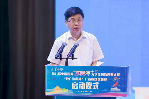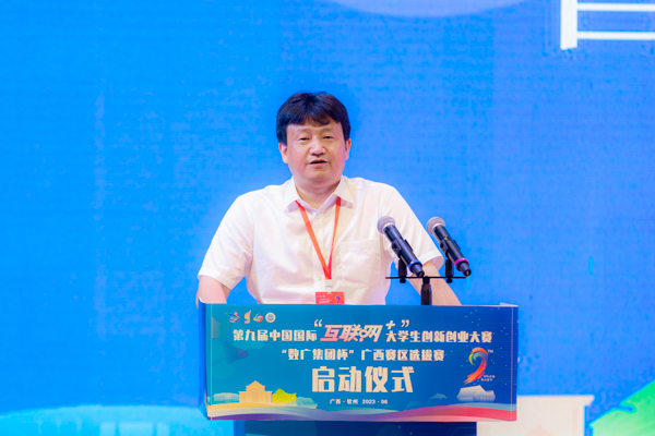校党委书记韩峻峰在致辞中指出,今年正值学校建校50周年暨举办师范教育117周年,学校始终把人才培养作为首要任务,坚守为党育人、为国育才初心,深入贯彻落实国家、自治区关于促进创新创业的决策部署,坚持创新引领创业、创业带动就业,建立创新创业实践基地5个,并被教育部认定为“国家级科技特派员创业培训基地”,成为自治区级创新创业教育实践基地建设单位,形成具有地方院校特色的创新创业教育体系。他表示,湾大将以此次大赛为契机,在主办单位的指导下,引领广大青年学子扎根八桂大地,用创新创业成果服务社会,助力壮美广西高质量建设,早日共圆复兴梦想。