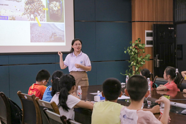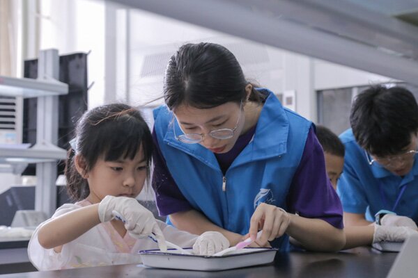 海洋协会的成员手把手指导“湾二代”做科学小实验