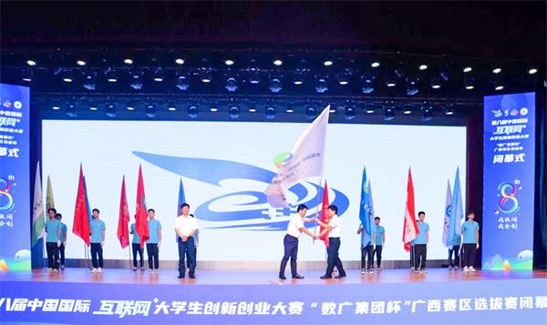 在当天颁奖仪式结束后,作为下一届大赛的承办方,我校党委书记韩峻峰从自治区教育厅副厅长伍春辉、桂林理工大学校长解庆林手中接过了赛旗。(何舒婷 摄)