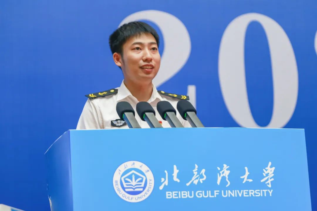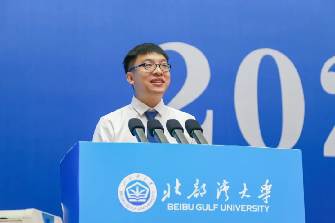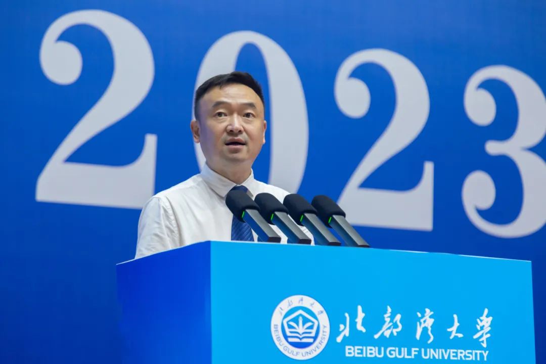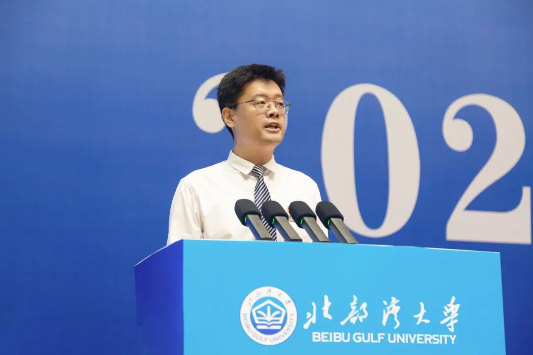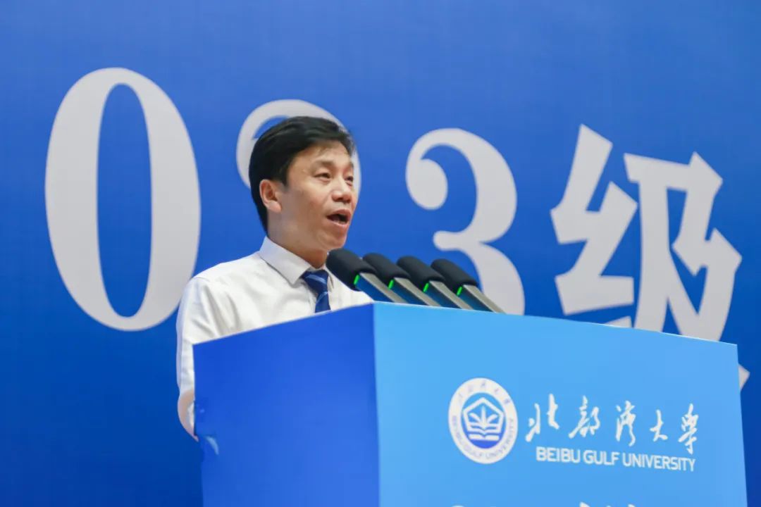 典礼上,校党委书记韩峻峰、校长苗剑为新生代表佩戴北部湾大学校徽。全体新生与学校教师代表进行了郑重宣誓。