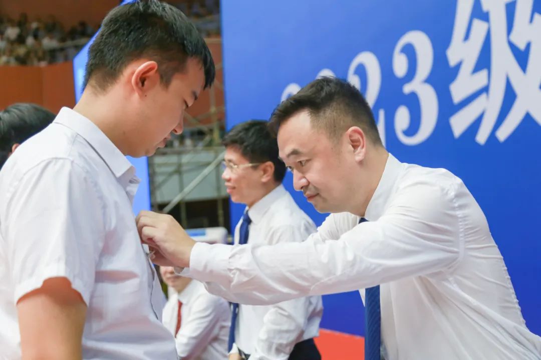 韩峻峰书记为新生代表佩戴北部湾大学校徽