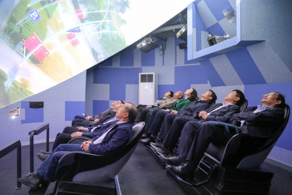 在鲸豚5D球幕影院,黄武海一行观看学校近几年的鲸豚研究纪录片
