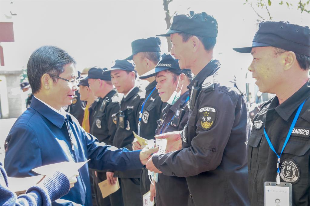 陈锦山一行首先来到东门保卫处警务室看望慰问正在值守的安保人员。“人员集合完毕,岗上一切情况正常,请领导指示!”安保人员迅速集合,立正敬礼,向陈锦山汇报校园执勤情况。“大家新年好!”陈锦山与执勤安保人员一一握手,并送上慰问品。陈锦山对他们一年来团结一心抓好疫情防控,加强校园安全管理等工作表示充分肯定,强调节日期间仍要加强值班值守工作,确保校园秩序安全稳定。