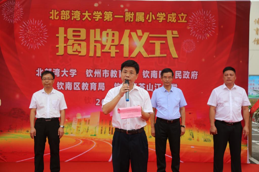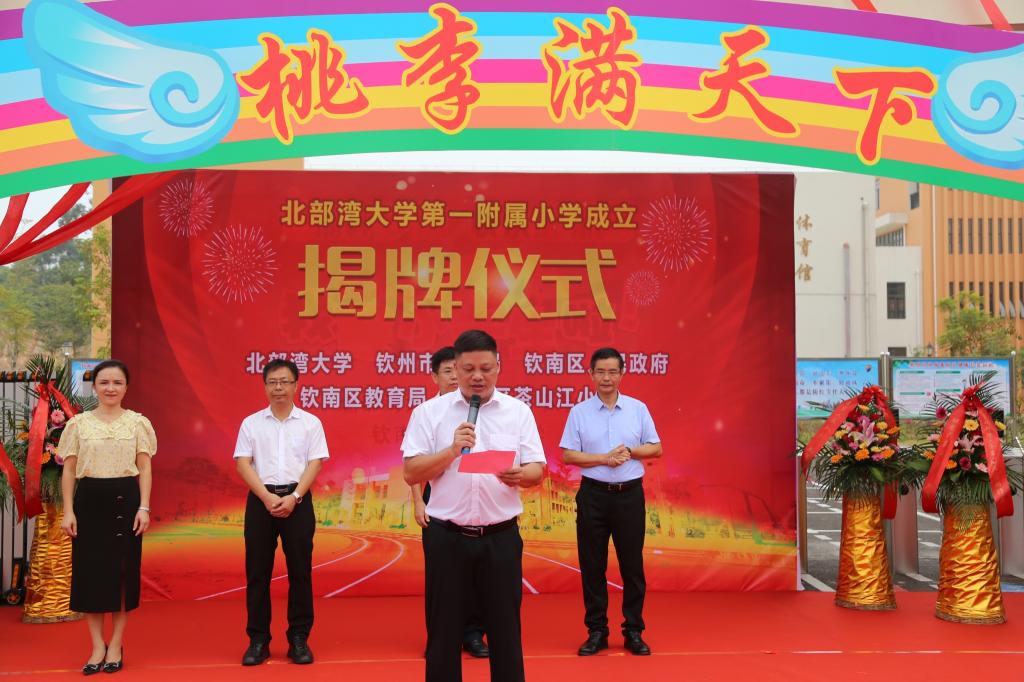 9月3日上午,北部湾大学第一附属小学正式揭牌。校长韩峻峰,党委副书记陈锦山,钦州市教育局局长赖廷耀,钦南区人民政府副区长杨俊等领导出席揭牌仪式。钦南区教育局党组副书记、副局长吴庆彪主持揭牌仪式。