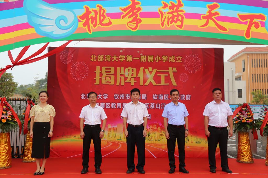 校长韩峻峰(中)、副书记陈锦山(右二)、教育局局长赖廷耀(左二)、钦南区政府副区长杨俊(右一)、附属小学校长梁春红(左一)为北部湾大学第一附属小学揭牌