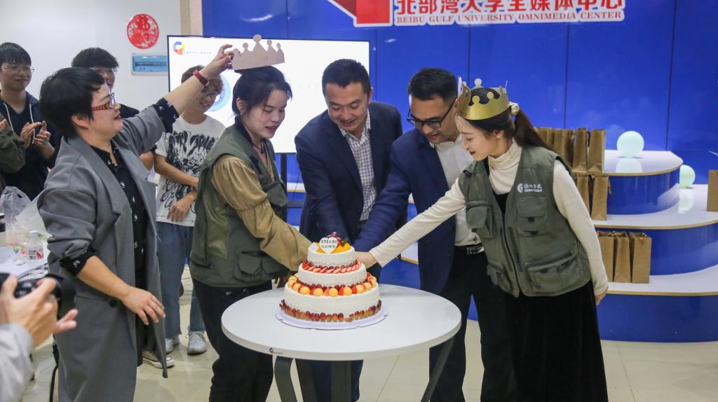 11月15日晚,学校党委常委、副校长陈磊在大学生活动中心湾大全媒工作室与全媒的小记者们共同庆祝第22个记者节暨全媒体中心成立五周年。历届全媒学子和区内其他高校的融媒体中心也纷纷发来祝福视频,共庆节日。北部湾大学广播电台、北部湾大学出版团代表到场共贺。