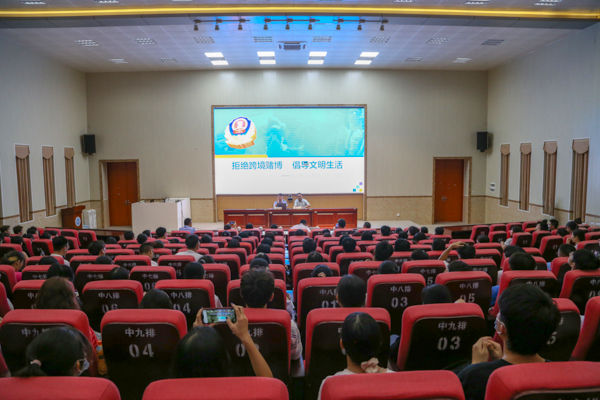 在宣讲中,钦州市公安局治安警察支队支队长陈鹏结合大学生身边的赌球、棋牌游戏、抢红包等大量现实案例总结了网络跨境赌博门槛低、隐蔽性强,危害性强的三个特点,让同学们全面认识跨境赌博。他指出,大学生要识别网络跨境赌博的套路,遵守网络安全管理秩序,提高防赌拒赌能力。他还介绍了钦州警方打击跨境赌博的措施和成效,警示同学们远离跨境赌博。
